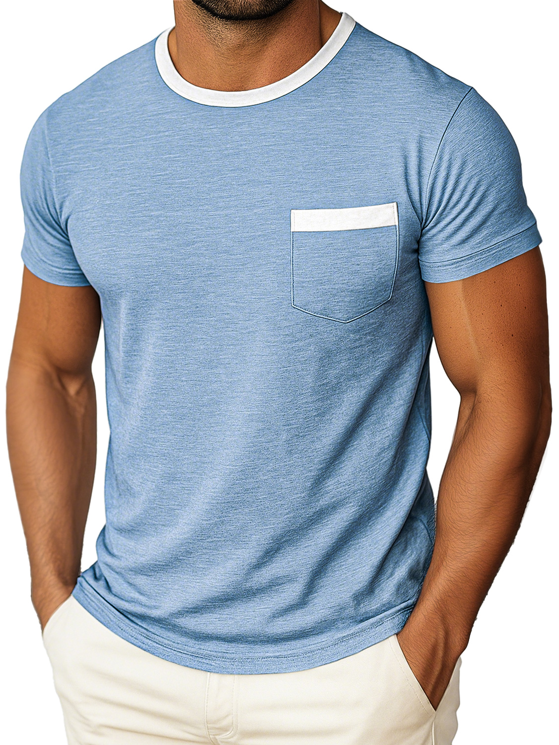 Men's Daily Round Neck Color Matching Pocket Casual Short Sleeve T-shirt
