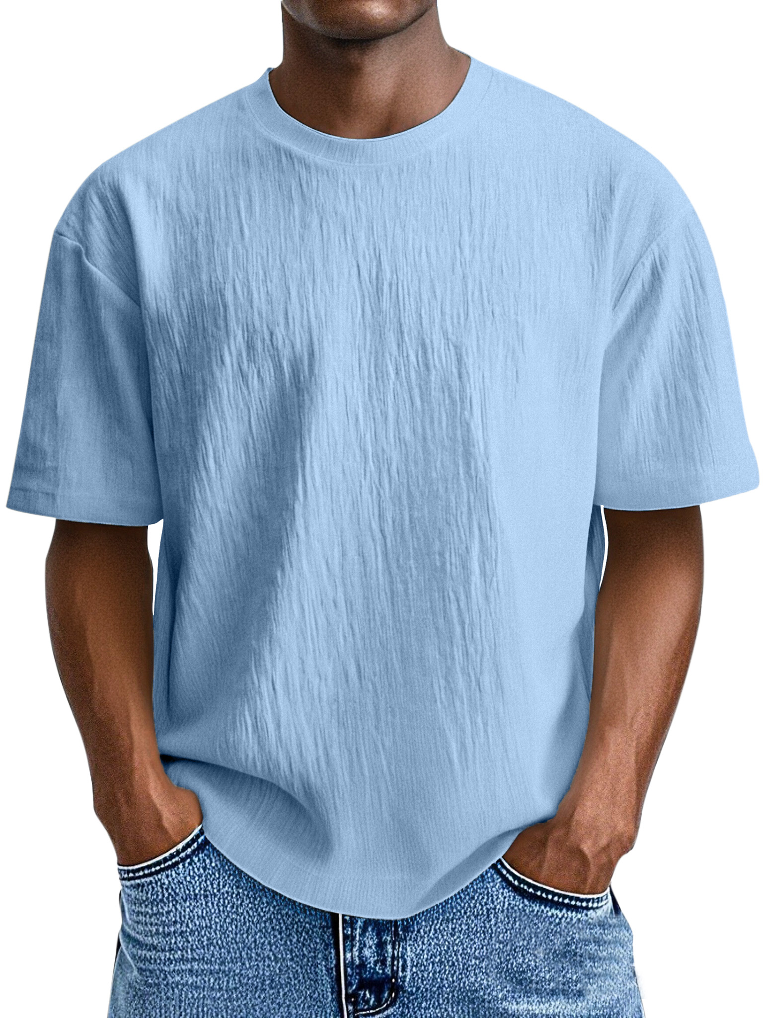 Men's Simple, Comfortable And Loose Solid Color Pleated Round Neck Short-sleeved T-shirt