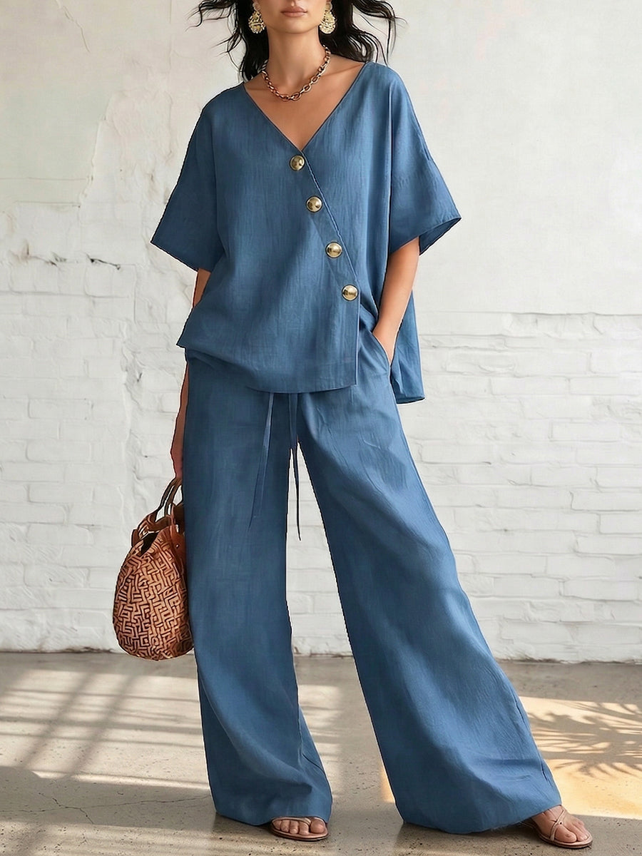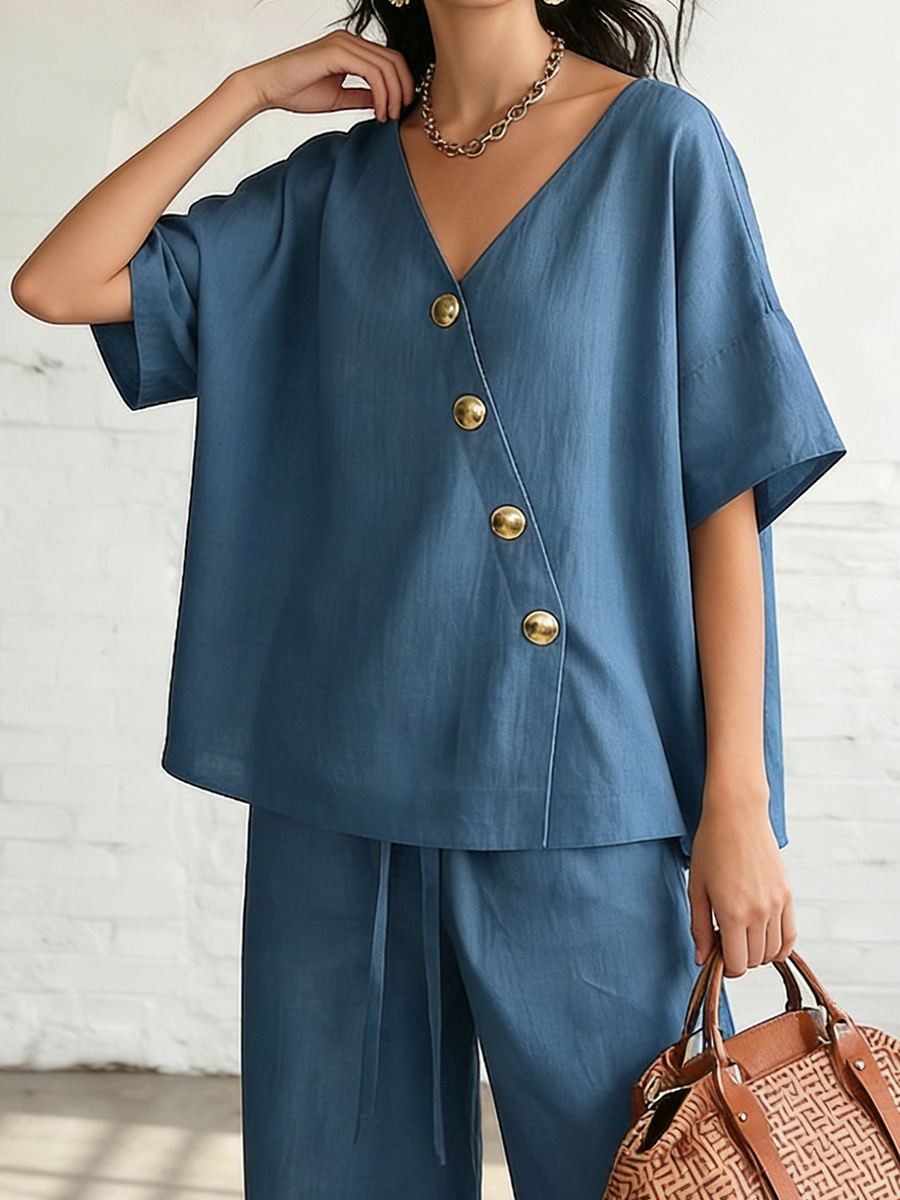 New Arrivals🔥Women's Cozy & Elegant Metal Buttons Cotton-linen Two-piece Set
