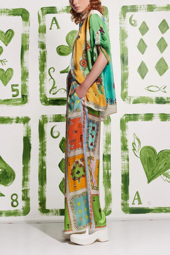 Funny Poker Summer Satin Unique Print Button Down Oversized Blouse