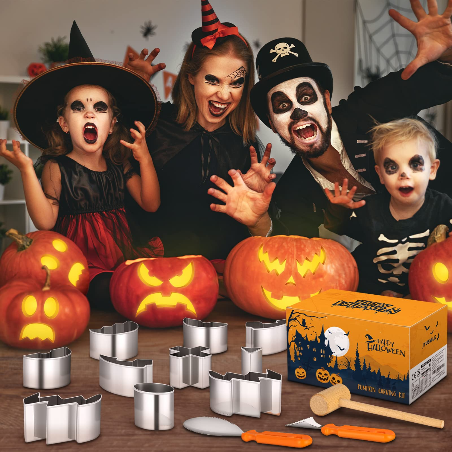 👏 2022 Upgraded Professional Pumpkin Carving Kit: Our Halloween pumpkin carving kit covers 1x wooden hammer, 1x Pumpkin Scoop, 1x V-cutter, and 10x carving stencils. Just one pumpkin carving set satisfy different pumkin patterns on Halloween night. The different specifications of the best professional pumpkin carving tools for adults kids are perfect for Halloween DIY, helping family to create a unique creative Jack-O'-Lantern for Halloween home decor.