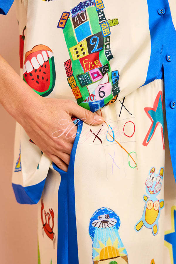 Vibrant Beach Satin Unique Print Colorblock Trim Elastic Waist Pocketed Wide Leg Pants