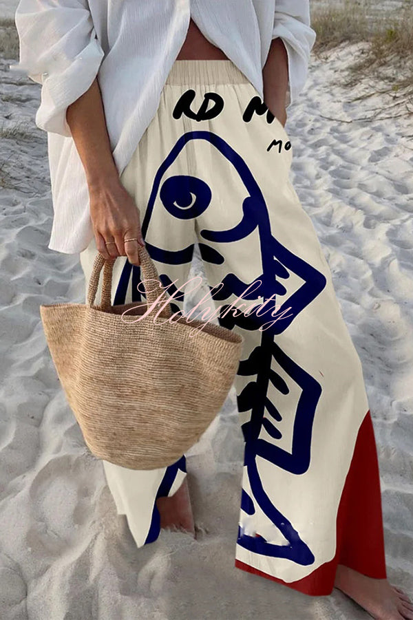 Unique Marine Print Elastic Waist Loose Pocket Pants